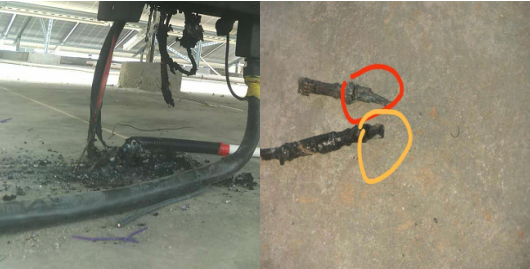 售后服務(wù)工程師到現(xiàn)場(chǎng)發(fā)現(xiàn),逆變器下端的接線端子已經(jīng)燒毀,經(jīng)過(guò)現(xiàn)場(chǎng)仔細(xì)勘察,確定是由于施工的時(shí)候不規(guī)范的壓接(黃圈內(nèi)的接頭),接頭沒(méi)做好,虛接打火引發(fā)電弧,造成電纜燒斷和逆變器端子燒毀。