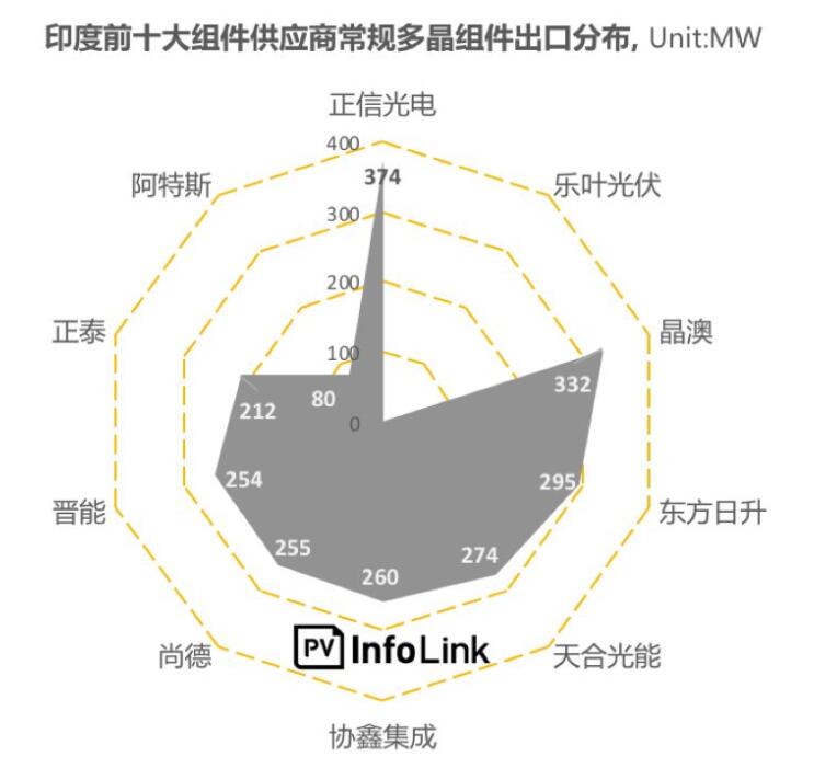 根據(jù)2018上半年中國(guó)海關(guān)組件出口統(tǒng)計(jì),印度市場(chǎng)前十大中國(guó)組件供應(yīng)商共占中國(guó)出口印度總量76.5%的組件份額。