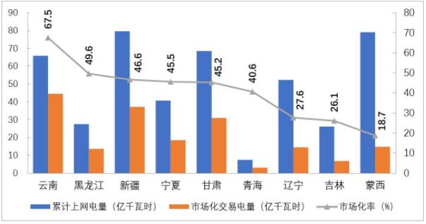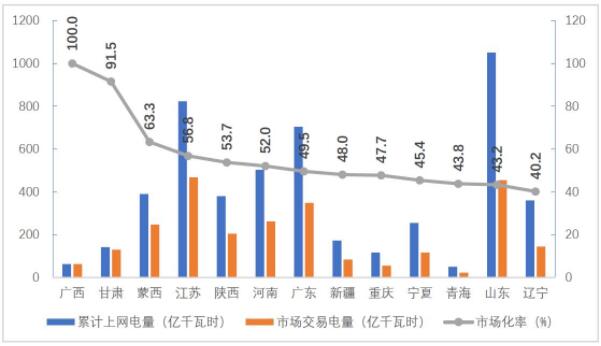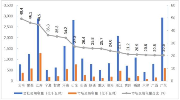分省來看,市場交易電量占全社會(huì)用電量比重排序前三名的省份是云南、蒙西和江蘇,分別為49.4%、46.1%、44.5%;電力市場交易電量規(guī)模排序前三名的省份分別為江蘇1286億千瓦時(shí)、山東768億千瓦時(shí)、廣東599億千瓦時(shí);外受電市場交易電量排序前三名的省份分別是江蘇286億千瓦時(shí)、山東242億千瓦時(shí)和浙江160億千瓦時(shí)。
