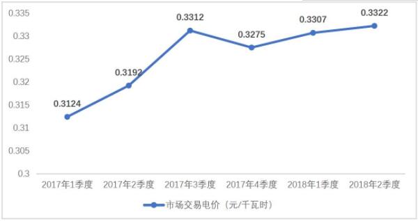 2017年以來,隨著煤炭市場價(jià)格波動(dòng)拉升以及市場交易的理性回歸,煤電市場交易電價(jià)呈緩步回升趨勢。2018年2季度,大型發(fā)電集團(tuán)煤電市場交易平均電價(jià)為0.3322元/千瓦時(shí),同比回升4.07%。