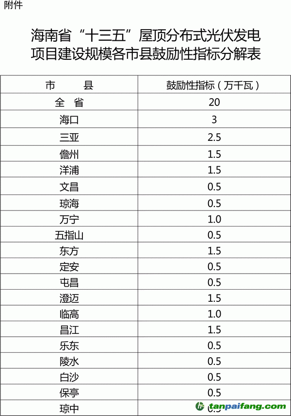 附件:海南省“十三五”屋頂分布式光伏發(fā)電項目建設(shè)規(guī)模各市縣鼓勵性指標分解表