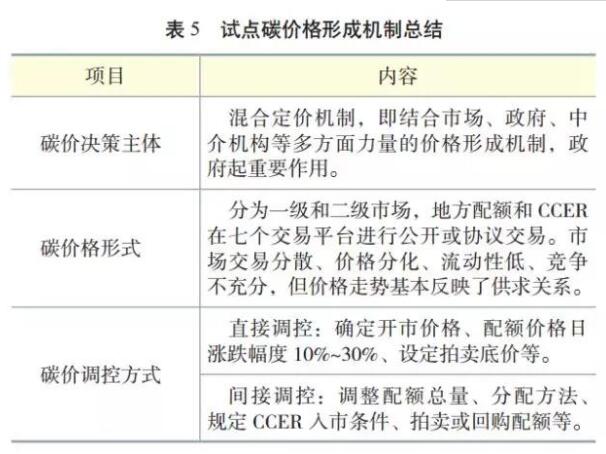 目前對碳價形成機(jī)制方面的研究文獻(xiàn)并不多見,國外研究大都集中在對相對成熟的EUETS交易體系的實證研究,國內(nèi)學(xué)者提出了基于合作博弈的碳配額交易價格形成機(jī)制[6]以及包括碳排放權(quán)價格的決策主體、形成方式以及調(diào)控方式等三方面內(nèi)容的價格形成機(jī)制[7]。本文以后者為分析框架,在研究試點碳市場運行、識別和衡量碳價影響因素的基礎(chǔ)上,總結(jié)了試點碳市場的碳價形成機(jī)制,見表5。