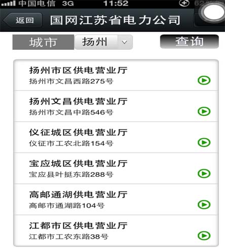 點擊“網(wǎng)點信息”,即會出現(xiàn)所屬城市的市區(qū)供電營業(yè)廳;點擊每欄右下角的綠色指示箭頭,便會有此供電營業(yè)廳的電話和地址,方便您進行電話直接咨詢。