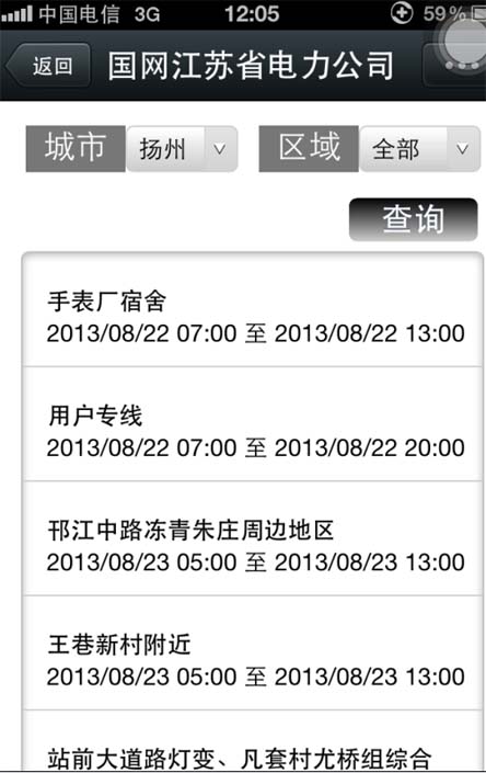 點擊“停電信息”,選擇所在城市與區(qū)域,顯示從選擇日開始的選擇區(qū)域內(nèi)相關(guān)停電信息,方便您及早獲知停電信息。