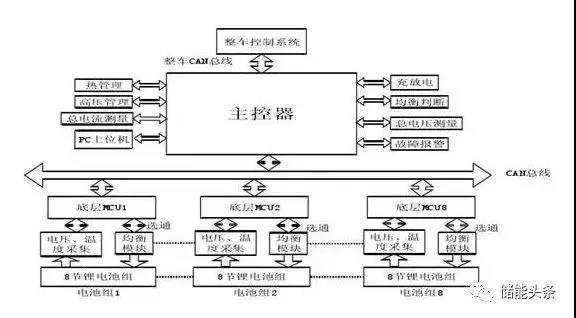 動力電池管理系統(tǒng),只有一層集中式或者兩分布式,基本不會出現(xiàn)三層的情況。小型車主要應(yīng)用一層集中式電池管理系統(tǒng)。兩層的分布式動力電池管理系統(tǒng),如下圖所示。