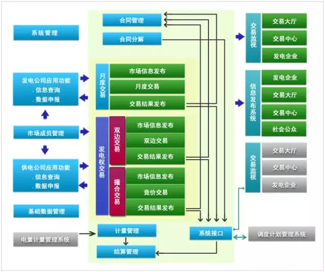 電力市場(chǎng)交易運(yùn)營(yíng)系統(tǒng)目前包括:市場(chǎng)成員管理、基礎(chǔ)信息管理和系統(tǒng)管理等三個(gè)數(shù)據(jù)管理模塊;負(fù)荷電量預(yù)測(cè)、合同管理、合同分解、數(shù)據(jù)申報(bào)、交易管理、結(jié)算管理等六個(gè)主要的業(yè)務(wù)功能模塊;以及信息查詢、交易大廳信息發(fā)布、交易監(jiān)視、市場(chǎng)分析評(píng)估等四個(gè)主要的信息服務(wù)模塊。應(yīng)用軟件功能結(jié)構(gòu)如下圖所示: