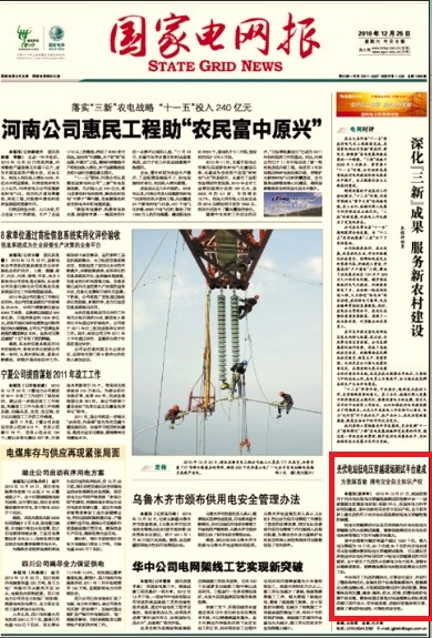 2010年12月27日,國家電網報頭版報道我國首套擁有完全自主知識產權的光伏電站低電壓穿越現(xiàn)場測試平臺在國網電科院建成。 詳見:http: epaper indaa com cn html 2010-12 25 content_255330 htm