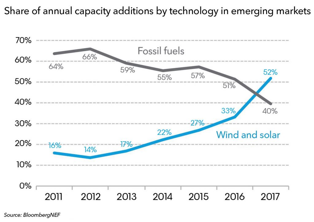 這種轉變正受到清潔能源技術經濟快速發(fā)展的推動,尤其是風能和太陽能技術。由于許多發(fā)展中國家的特殊自然資源和大幅降低的設備成本,新的可再生能源項目現在經常以價格競爭新的化石廠,即使在沒有補貼的情況下。這一點在2017年新興市場通過招標承包的新能源裝機達到28GW以上這一結果最為明顯,其中包括開發(fā)商承諾以低至17.7美元/兆瓦時的價格提供風能,以及低至18.9美元/兆瓦時的太陽能。