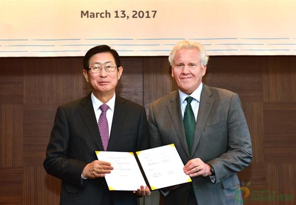 來自韓國電力公司的代表,首席執(zhí)行官HwanEikCho和首席電網官BongSooMoon,通用電氣董事長兼首席執(zhí)行官JeffImmelt,通用電氣韓國公司首席執(zhí)行官ChrisKhang共同參加簽約儀式。