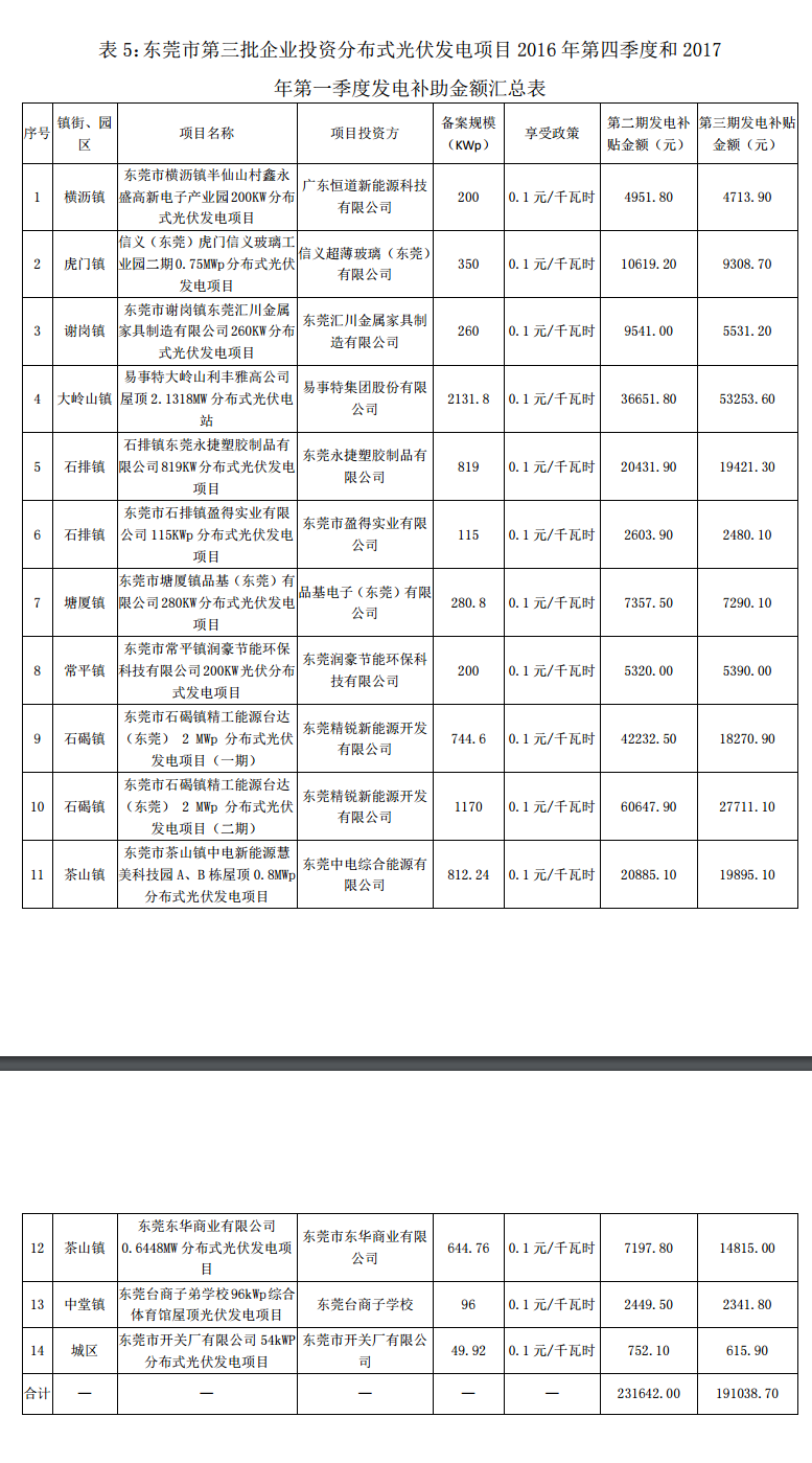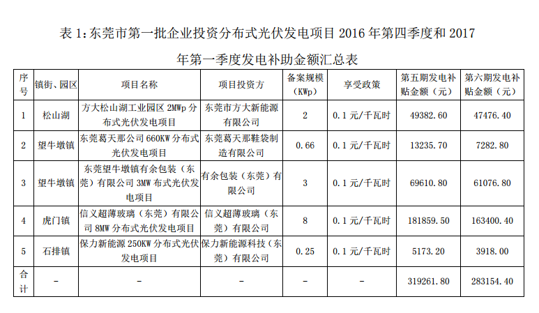 廣東東莞市前四批分布式光伏項(xiàng)目補(bǔ)助名單(2016-2017Q1)