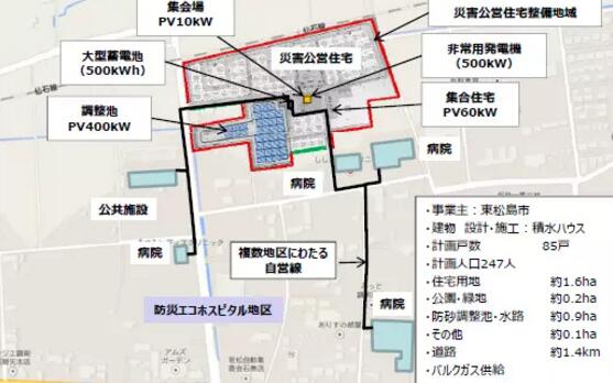 在 4 萬人口的東松島市,新型電網(wǎng)的鋪設(shè)與災(zāi)害公營住宅建設(shè)同時(shí)進(jìn)行。日本最大的住宅建造商之一,積水房屋株式會社也參與其中,共同建設(shè)了智能防災(zāi)小鎮(zhèn)。