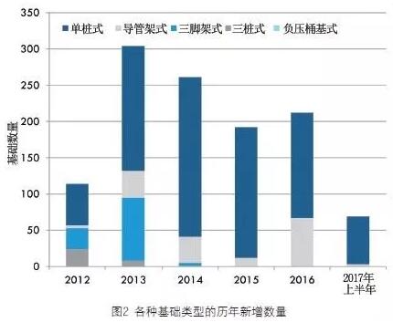 69 個基礎(chǔ)中,只有單樁式和導(dǎo)管架式兩種類型,這與2015 年和2016年的情況相似。其中,單樁式的占比高達96%。
