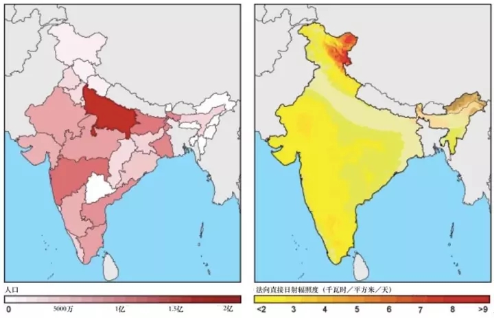 印度–各州人口(左圖)和年太陽輻射照度,千瓦時/平方米/天(右圖)