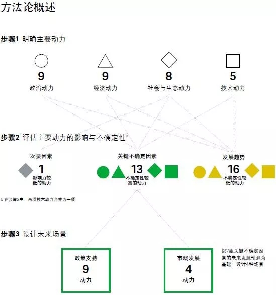 其中,“發(fā)展趨勢”是指影響程度較高、不確定性較低的因素,專家普遍認同這些因素將對各利益相關(guān)方的未來發(fā)展產(chǎn)生影響。“關(guān)鍵不確定因素”則包括可能對能源轉(zhuǎn)型產(chǎn)生重大影響的動力因素,但這些因素的不確定性較高。