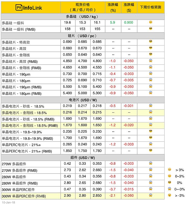 減少的國(guó)內(nèi)需求讓單,多晶組件價(jià)格都繼續(xù)下探,國(guó)內(nèi)常規(guī)組件價(jià)格普遍跌至每瓦2.65 - 2.68元人民幣之間,且跌勢(shì)持續(xù)中。由于二,三月會(huì)是今年上半年中需求最淡的時(shí)間點(diǎn),目前看來(lái)廠商的年前備貨力道并不會(huì)太強(qiáng)勁。