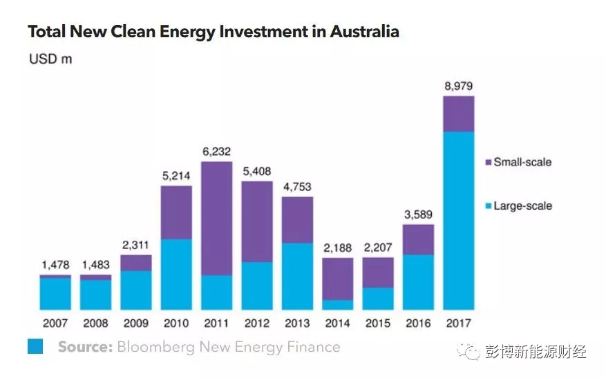 2017年,澳大利亞的清潔能源投資總額飆升至創(chuàng)紀(jì)錄的90億美元,直接將其推升至全球清潔能源投資排行榜的第七位。2017年,為了抓緊實(shí)現(xiàn)大規(guī)模