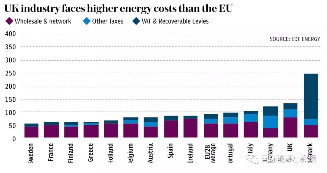 英國低碳轉(zhuǎn)型也是有成本的,目前英國工業(yè)用電價格在歐盟僅次于丹麥,排在第2位,在一定程度影響了英國企業(yè)的競爭性。