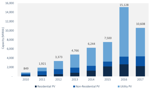 根據(jù)GTM Research和太陽(yáng)能行業(yè)協(xié)會(huì)的新報(bào)告,2017年美國(guó)太陽(yáng)能光伏市場(chǎng)新增10.6吉瓦的容量,比2016年下降了10%。