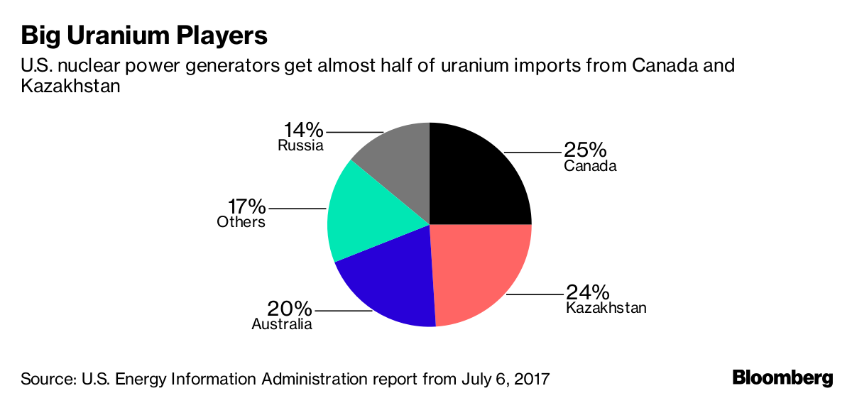 目前,鈾供應(yīng)商正在援引特朗普政府用于對鋼鐵和鋁進口征收關(guān)稅的貿(mào)易擴張法案中的同一部分。如果他們?nèi)〉贸晒?,美國的核能發(fā)電機可能會面臨更高的鈾進口成本,而這些成本幾乎占其總供應(yīng)量的90%。加拿大和哈薩克斯坦是美國最大的兩個鈾資源進口來源國,占其總需求的一半左右。此外,澳大利亞和俄羅斯也是主要進口來源國。