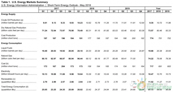 表一:美國(guó)的能源生產(chǎn)、消費(fèi)量預(yù)測(cè)(2018-2019)