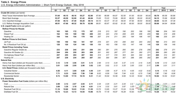 2017年美國(guó)WTI原油現(xiàn)貨均價(jià)為50.79美元/桶,EIA預(yù)計(jì)2018年全年WTI原油現(xiàn)貨平均價(jià)格為65.58美元/桶,2019年價(jià)格略有回降為60.86美元/桶。同時(shí),EIA預(yù)測(cè)2018年布倫特原油均價(jià)為70.68美元/桶,2019年降為65.98美元/桶。