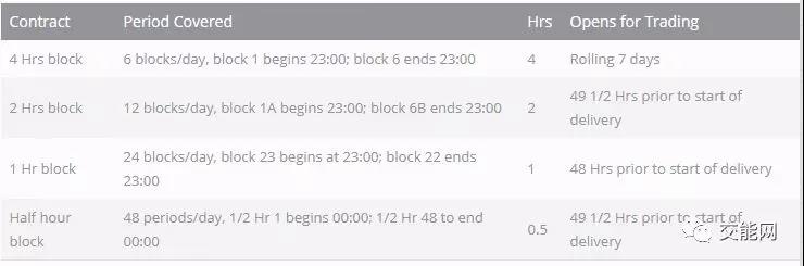 小時(shí)交易合約覆蓋日前合約以外的4小時(shí),交易時(shí)間為10:15 PM,在相應(yīng)的流動(dòng)期前三天。日前合同可以作為基本負(fù)荷(每小時(shí)1MW的恒流電力,11:00 PM到第二天晚上11:00 PM,每日) 和峰值負(fù)荷(恒流每小時(shí)1MW的電力,7:00 AM到7:00 PM,周一至周五)。這些合約在上市前兩天的10:15 PM上市交易。所有合同的報(bào)價(jià)單位是£/kWh,最小單位為£0.01?,F(xiàn)貨合約是連續(xù)交易的。