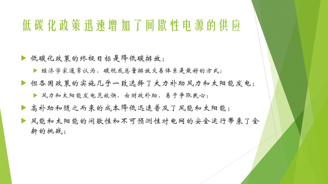 世界各國都在大力鼓勵可再生能源的發(fā)展,紛紛制定了各種各樣的鼓勵再生能源發(fā)展的政策,如優(yōu)先入網(wǎng)、優(yōu)先調(diào)度、電價(jià)補(bǔ)貼、固定上網(wǎng)電價(jià)、綠證制度,碳稅政策等。