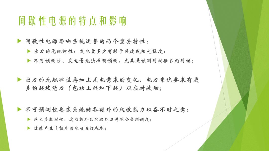 在間歇性電源大規(guī)模接入的情況下,電網(wǎng)需要有更多的靈活性以保障安全:必須要用其他快速反應(yīng)電源來平衡間歇性電源的波動;必須保證足夠的爬坡度來抵消間歇性電源預(yù)測的誤差(包括上調(diào)和下調(diào));電網(wǎng)的阻塞管理更加困難。