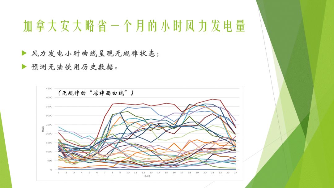 以加拿大安大略省一個(gè)月的小時(shí)風(fēng)力發(fā)電量數(shù)據(jù)為例,可以看到風(fēng)力發(fā)電小時(shí)曲線呈現(xiàn)無規(guī)律狀態(tài)。這意味著,在進(jìn)行預(yù)測時(shí),無法利用歷史數(shù)據(jù)。