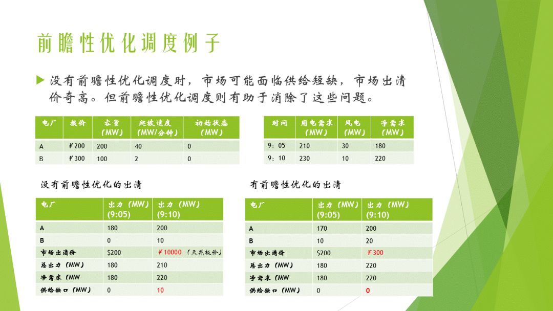 沒有前瞻性優(yōu)化的情況下,在9:05,電廠A出力為180MW,電廠B出力為零。到9:10,A可以增加出力20MW到200MW,B可以增加出力10MW,總共增加30MW,但負(fù)荷在9:05到9:10之間增加了40MW,一些負(fù)荷無法滿足,所以啟動了市場最高限價(jià)——天花板價(jià)10000¥/MW。
