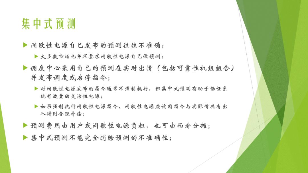 對間歇性電源,可以采用由調(diào)度機(jī)構(gòu)統(tǒng)一預(yù)測的方式以提高預(yù)測精度。多個(gè)電力市場采用這種方法。預(yù)測成本可以由市場通過一定方式分?jǐn)偝鋈ァ?/p>
