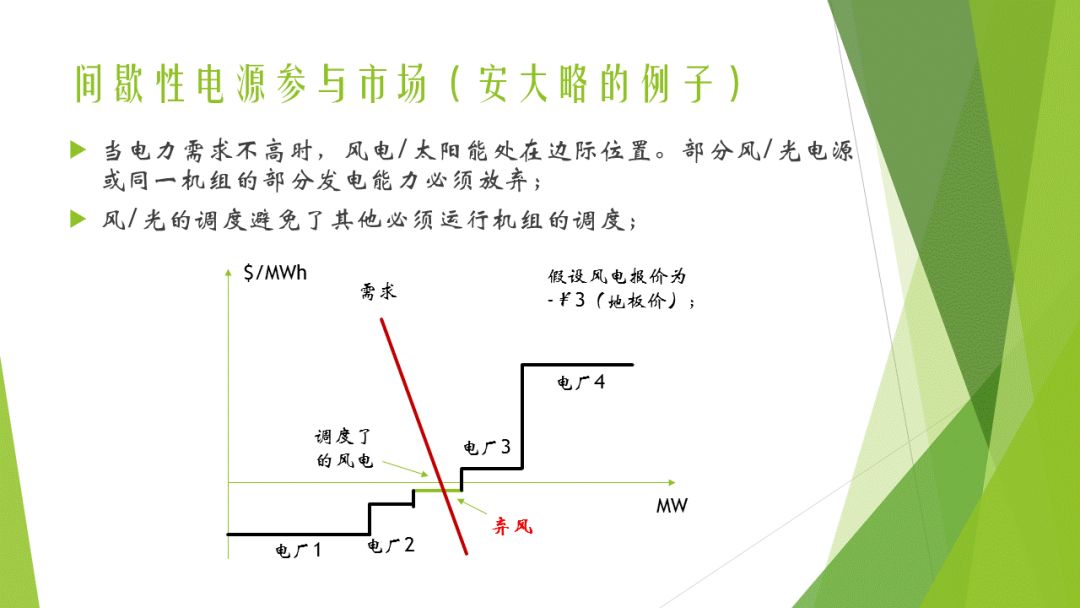 對受補(bǔ)貼的可再生能源參與市場的報(bào)價(jià)的控制起到很大的作用。如果沒有限制,可再生能源在現(xiàn)貨市場會申報(bào)接近其補(bǔ)貼值的負(fù)的價(jià)格。比如,如果補(bǔ)貼是0.5¥/kWh,其原意申報(bào)-0.45¥/kWh的價(jià)格,這樣仍然有0.05¥/kWh的利潤。這種情況下,其發(fā)電成本排序經(jīng)常在非常靠左的位置,下調(diào)時(shí)更可能調(diào)度傳統(tǒng)的機(jī)組。如果限制可再生能源的地板價(jià)為-0.03¥/kWh,則這些機(jī)組可能處在邊際機(jī)組的位置,從而被調(diào)度棄風(fēng)/棄光。