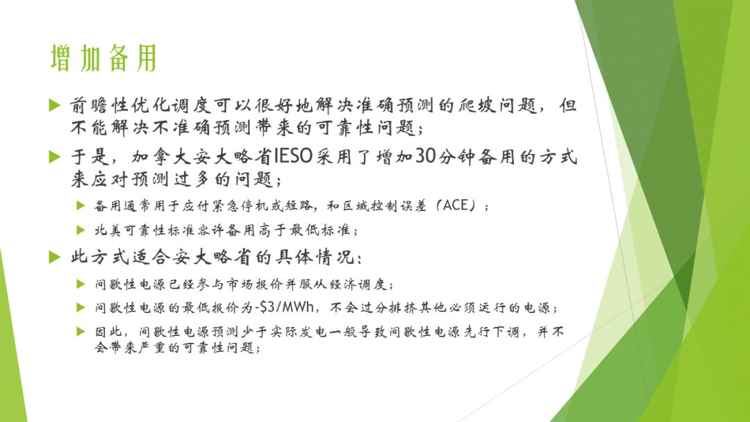 傳統(tǒng)上應(yīng)對間歇性電源的一些方法包括:調(diào)度員人為要求靈活性機(jī)組提前啟動或停機(jī)(非完全市場的行為);購買更多的自動發(fā)電控制;人為調(diào)低對間歇性電源的預(yù)測或增加對需求的預(yù)測。