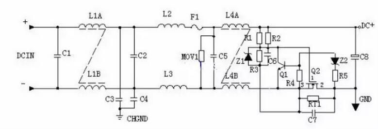 ②R1、R2、R3、Z1、C6、Q1、Z2、R4、R5、Q2、RT1、C7組成抗浪涌電路。在起機的瞬間,由于C6的存在Q2不導通,電流經(jīng)RT1構(gòu)成回路。當C6上的電壓充至Z1的穩(wěn)壓值時Q2導通。如果C8漏電或后級電路短路現(xiàn)象,在起機的瞬間電流在RT1上產(chǎn)生的壓降增大,Q1導通使Q2沒有柵極電壓不導通,RT1將會在很短的時間燒毀,以保護后級電路。
