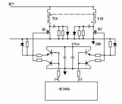 5、有驅(qū)動變壓器的功率變換電路:T2為驅(qū)動變壓器,T1為開關(guān)變壓器,TR1為電流環(huán)。