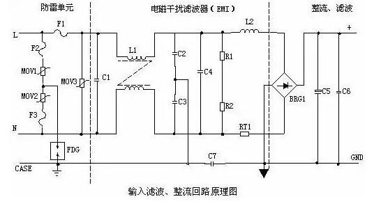 ②、輸入濾波電路:C1、L1、C2、C3組成的雙π型濾波網(wǎng)絡(luò)主要是對輸入電源的電磁噪聲及雜波信號進(jìn)行抑制,防止對電源干擾,同時也防止電源本身產(chǎn)生的高頻雜波對電網(wǎng)干擾。當(dāng)電源開啟瞬間,要對C5充電,由于瞬間電流大,加RT1(熱敏電阻)就能有效的防止浪涌電流。因瞬時能量全消耗在RT1電阻上,一定時間后溫度升高后RT1阻值減小(RT1是負(fù)溫系數(shù)元件),這時它消耗的能量非常小,后級電路可正常工作。