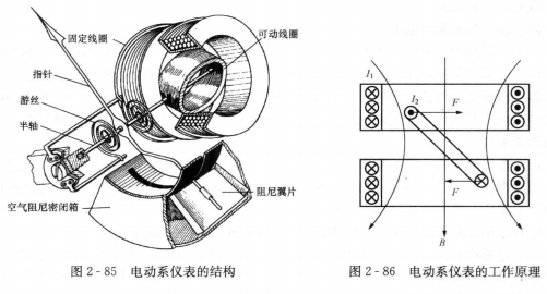 電動系儀表的工作原理如圖2-86所示。固定線圈通人直流電I1,產(chǎn)生磁場,磁感應(yīng)強(qiáng)度為B,可動線圈通入直流電I2,可動線圈在磁場中受到電磁力F作用,并產(chǎn)生偏轉(zhuǎn)。作為功率表使用,指針偏轉(zhuǎn)角正比于被測功率。