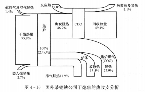 焦化生產(chǎn)中,出爐紅焦顯熱占焦?fàn)t能耗的35%~40%,采用干熄焦可回收約80%的紅焦顯熱。按照目前技術(shù)條件,平均每干熄1t焦,可回收450℃,3.9MPa的蒸汽0.45t以上;扣除干熄焦工藝的自身電耗,可凈發(fā)電20~30kWh/t焦,折合標(biāo)準(zhǔn)煤8~12kg/t。根據(jù)寶鋼的生產(chǎn)實(shí)際,CDQ可降低能耗50~60kg/t,國外某鋼鐵公司對其煉焦?fàn)t和CDQ得熱收支進(jìn)行分析,如圖4-16所示,可見,CDQ可回收煉焦能耗的49.4%。
