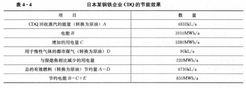 日本某鋼鐵企業(yè)對其CDQ技術(shù)的節(jié)能效果進(jìn)行計算,計算結(jié)果如表4-4所示。年節(jié)約電能850MWh/a,總的有效燃料節(jié)約量(換算為原油)4730kL/a。