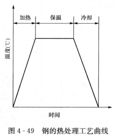 鋼的熱處理工藝過程包括加熱、保溫和冷卻三個(gè)階段,它可用溫度一時(shí)間坐圖形來表示,稱為鋼的熱處理工藝曲線,如圖4-49所示。