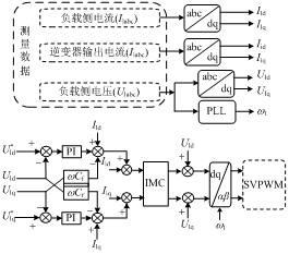 圖1中MMC-SST的輸出級采用DC/AC逆變器,其電壓外環(huán)采用PI控制器控制輸出穩(wěn)定的工頻交流電壓,電流內環(huán)采用內??刂破鲗V波電感的反饋電流和負載電流前饋補償電流進行無靜差跟蹤控制,使其具有較大的限流能力、較好的動態(tài)響應性能和較強的抗負載擾動能力。同時,為提高逆變器直流電壓利用率,減小開關損耗,本文采用空間電壓矢量調制技術(space vector pulse width modulation,SVPWM)[21]。關于DC/AC逆變器的電流內環(huán)控制器的設計和MMC類似,鑒于此可得到基于內模電流內環(huán)和PI電壓外環(huán)的MMC-SST輸出級控制策略如圖6所示,圖中Iid、Iiq為三相DC/AC逆變器輸出電流在dq旋轉坐標系下的d軸分量和q軸分量,Uld、Ulq, Ild、Ilq為負載電壓、電流在dq旋轉坐標系下的d軸分量和q軸分量;U*ld、U*lq為負載電壓在dq旋轉坐標系下的d軸分量和q軸分量的參考值;ωl為交流輸出電壓角頻率;Ro、Lf、Cf 分別為三相DC/AC逆變器和輸出線路等效電阻、電感和濾波電容。其中,IMC環(huán)節(jié)和圖7基本相同,此時,R′、L′分別為DC/AC逆變器輸出側的電感和電阻的估計值。