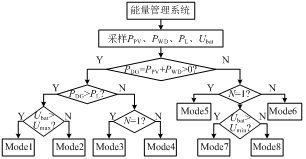 新型直流微網(wǎng)系統(tǒng)工作模式切換控制流程如圖8所示。為判斷系統(tǒng)在不同模式下相應的工作狀態(tài)及實現(xiàn)不同工作狀態(tài)之間的切換,需要對UPV、IPV、UWD、IWD、Ubat及負載功率 PL進行檢測,UPV、IPV用來計算光伏發(fā)電系統(tǒng)輸出功率PPV,UWD、IWD用來計算風力發(fā)電系統(tǒng)輸出功率PWD。由蓄電池的工作特性可知,當蓄電池充電時,端電壓 Ubat會隨之上升;當蓄電池放電時,端電壓會有所下降。根據(jù)這一特性,設定蓄電池放電最小電壓Umin,蓄電池充電最大電壓Umax,用以判斷是否允許蓄電池充放電。對配電網(wǎng)故障信號N進行檢測,用于判斷配電網(wǎng)出現(xiàn)故障。為方便控制,做以下定義:配電網(wǎng)正常時N=1,配電網(wǎng)故障狀態(tài)時N=0。