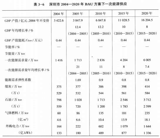 深圳市2004-2020年BAU方案下一次能源供應(yīng)列于表3-6。從表3-6可以看出,BAU方案下2005年一次能源需求量為l 713萬(wàn)tce,2010年為2 836萬(wàn)tce,2015年為4 204萬(wàn)tce,2020年為6 005萬(wàn)tce。能源彈性系數(shù)2004-2005年為1.69,2005-2010年為0.9,2010-2015年為0.8,2015-2020年為0.8。