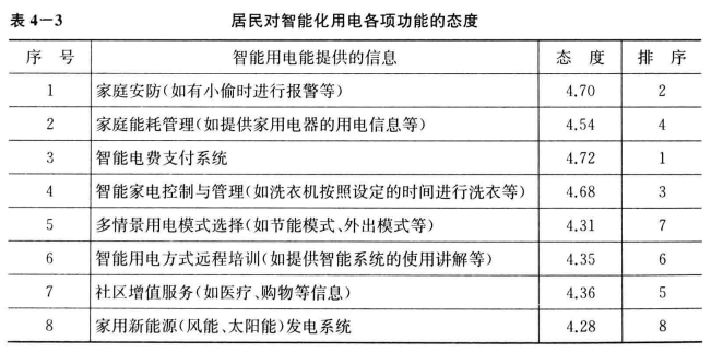 居民對(duì)智能化用電各功能態(tài)度如表4-3所示??傮w來(lái)看,居民對(duì)于家庭智能化用電所具有的各項(xiàng)功能比較偏好。對(duì)社區(qū)增值服務(wù)、智能用電方式遠(yuǎn)程培訓(xùn)、智能電費(fèi)支付系統(tǒng)、家庭能耗管理以及多情景用電模式選擇等功能偏好較高。此外,對(duì)家用新能源發(fā)電系統(tǒng)的偏好不是很高,原因是家用新能源發(fā)電系統(tǒng)在我國(guó)的推廣尚未成熟,成本和空間因素制約了其大范圍的普及推廣。
