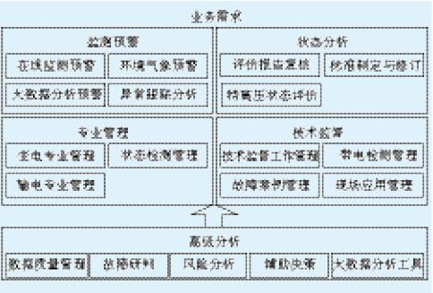 業(yè)務(wù)需求,即公司業(yè)務(wù)目標(biāo)及業(yè)務(wù)流程的分類描述,電網(wǎng)公司通過業(yè)務(wù)流程為政府、企業(yè)和居民等客戶提供電力服務(wù)、資產(chǎn)管理等業(yè)務(wù)。輸變電設(shè)備狀態(tài)預(yù)警系統(tǒng)主要為電網(wǎng)運(yùn)檢業(yè)務(wù)提供技術(shù)支撐,運(yùn)檢業(yè)務(wù)主要包括電力資產(chǎn)的維護(hù)、操作、管理與改造工作,狀態(tài)預(yù)警系統(tǒng)可為運(yùn)檢業(yè)務(wù)提供監(jiān)測預(yù)警、狀態(tài)分析、專業(yè)管理、技術(shù)監(jiān)督、高級(jí)分析五大類業(yè)務(wù)應(yīng)用,為電網(wǎng)公司運(yùn)檢業(yè)務(wù)提供全面的技術(shù)支撐。狀態(tài)預(yù)警系統(tǒng)業(yè)務(wù)需求框架如圖1所示。