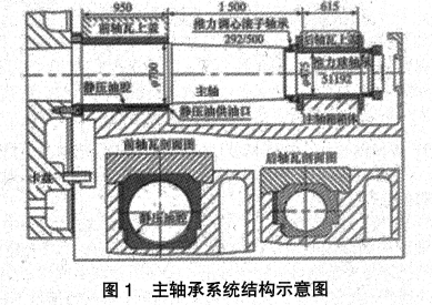 機床主軸軸承結(jié)構(gòu)由主軸承、卡盤、軸瓦、推力調(diào)心軸承、推力球軸承、軸承主板以及金屬螺母等部件所組成。重型臥車的主軸承系統(tǒng)如圖1所示。