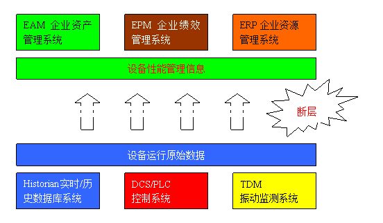 電廠在基礎(chǔ)信息化的投入包括先進的計算機分散控制系統(tǒng)(DCS系統(tǒng)),廠級實時/歷史數(shù)據(jù)庫系統(tǒng),企業(yè)資產(chǎn)管理系統(tǒng)(EAM)和計算機管理信息系統(tǒng)(MIS)等等。DCS和廠級實時/歷史數(shù)據(jù)庫系統(tǒng)采集保存著大量現(xiàn)場設(shè)備運行的原始數(shù)據(jù),而EAM和管理系統(tǒng)往往需要反映現(xiàn)場設(shè)備運行狀態(tài)和性能的設(shè)備性能數(shù)據(jù),在目前電廠的設(shè)備數(shù)據(jù)采集和設(shè)備性能分析處理之間還缺少一個統(tǒng)一的設(shè)備狀態(tài)性能管理平臺,如圖一所示: