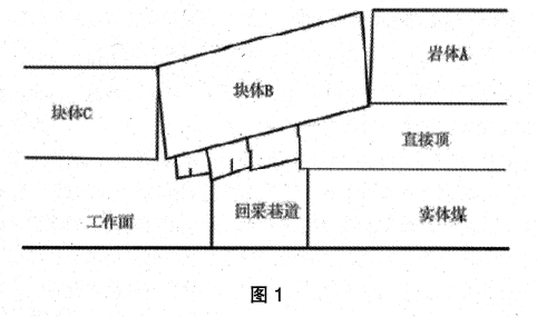在回采工作面不斷推進(jìn)下,基本頂達(dá)到極限跨距而直接頂垮落的時(shí)候,會(huì)導(dǎo)致斷裂破斷、破壞的巖塊失穩(wěn)回轉(zhuǎn)下沉,這就形成工作面的初次來壓。在同采工作面的推進(jìn)下,基本頂產(chǎn)生周期性破斷,逐漸形成工作面周期來壓。沿著工作面傾斜方向,工作面頂板在中部可看成砌體梁結(jié)構(gòu),在工作面的兩端頭部位的破斷線呈現(xiàn)弧形,逐漸形成弧形三角塊結(jié)構(gòu),弧形三角塊結(jié)構(gòu)也會(huì)隨著工作面的推進(jìn)不斷的破斷失穩(wěn)。在工作面推過后,直接頂隨著垮落或者下沉,最終和基本頂發(fā)生離層,。巾基本頂在直接頂發(fā)生離層后,因?yàn)閭?cè)向支撐壓力的作用在側(cè)向煤體內(nèi)發(fā)生斷裂,并且回轉(zhuǎn)和彎曲下沉。因此,建立如圖所示的端頭弧形三角塊結(jié)構(gòu)模型。這其中回采面巷道位于關(guān)鍵塊B的下方,而巖體A為巷道側(cè)煤體上方的基本頂巖層,巖快B作為本區(qū)段采空區(qū)的弧形三角塊,巖體C作為采空區(qū)的斷裂巖體。在工作面的推進(jìn)下,B塊巖體會(huì)逐漸發(fā)生旋轉(zhuǎn)下沉,位態(tài)和穩(wěn)定性都發(fā)生變化,C塊巖體下方的矸石被壓縮下沉A塊巖體下方的巖體受采場超前側(cè)向支撐壓力的影響會(huì)逐漸發(fā)生變化。