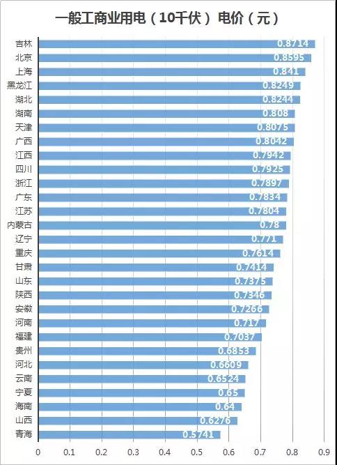 2018年,我國(guó)一般工商業(yè)電價(jià)的排行之中一直是吉林最高,吉林一般工商業(yè)用電價(jià)格為0.8864元比第二位的北京多出0.011元,比全國(guó)加總的平均電價(jià)0.76元要高出0.1264元。