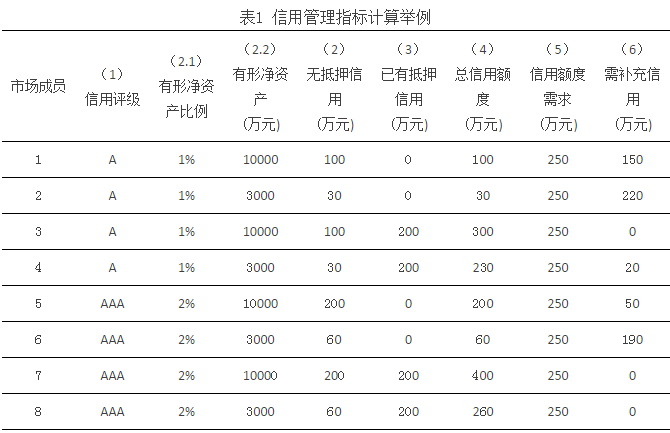 首先,可以根據(jù)各市場(chǎng)成員的信用等級(jí)(1)確定其有形凈資產(chǎn)比例(2.1),然后乘以有形凈資產(chǎn)(2.2),得到無(wú)抵押信用(2)。其次,無(wú)抵押信用(2)與已有抵押信用(3)相加得到總信用額度(4)。最后,信用額度需求(5)減去總信用額度(4)得到需補(bǔ)充的信用(6)。